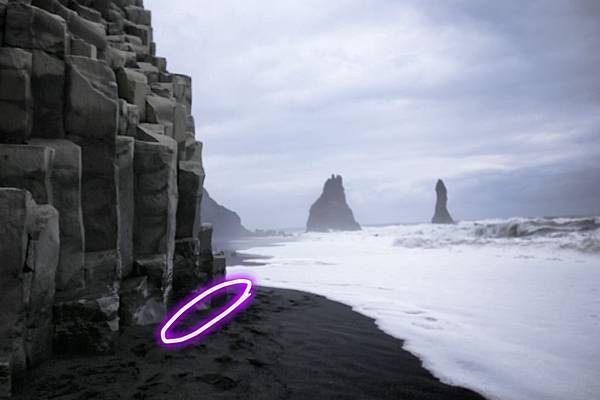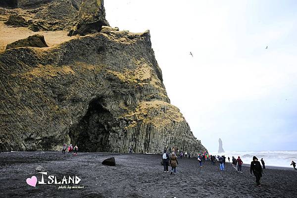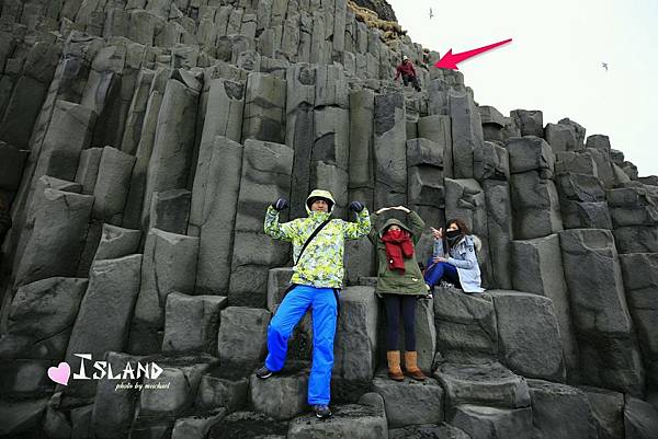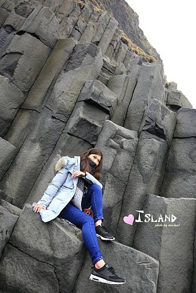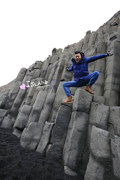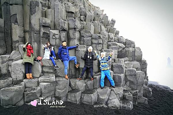 沿著柱狀玄武岩邊邊的海岸走過去,有兩個巨大岩石佇立在海上,是黑沙灘的地標,正當我們要走過去拍照,一個巨浪突然衝上來,我們6個人完全來不及閃,下半身全被浪打濕無一倖免...